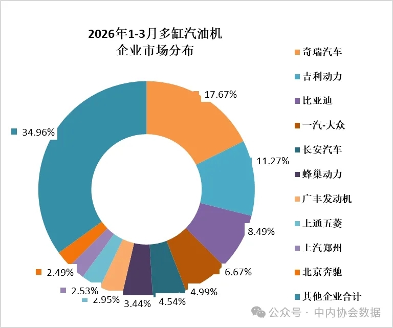 乘用车用在多缸汽油机占比为96.43%,3月销量189.99万台,环比增长100.25%,同比增长8.95%;1-3月累计销量438.05万台,同比增长-3.41%。奇瑞、吉利、比亚迪、一汽-大众、长安汽车、蜂巢动力、广丰发动机、上通五菱、上汽郑州、北京奔驰销量排在前列。