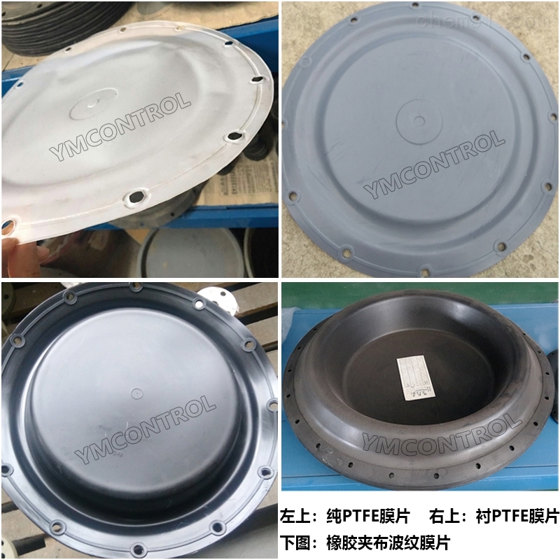 上图分别为:PTFE纯四氟膜片、 PTFE衬聚四氟乙烯膜片、 夹布橡胶波纹膜片
