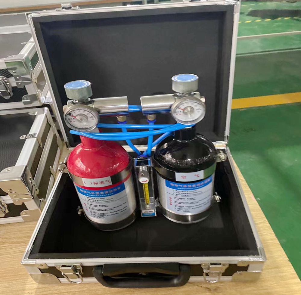 5.按规定,井下调校传感器和断电仪的装置由两个气瓶组合,一瓶新鲜空气,一瓶1-2%CH4甲烷标准气。按照使用条件不同,1%CH4一般用于校正传感器的报警点和断电仪的复电功能,如有必要可增加一单瓶1.5-2%CH4气样以校正上述仪器的断电点及线性。